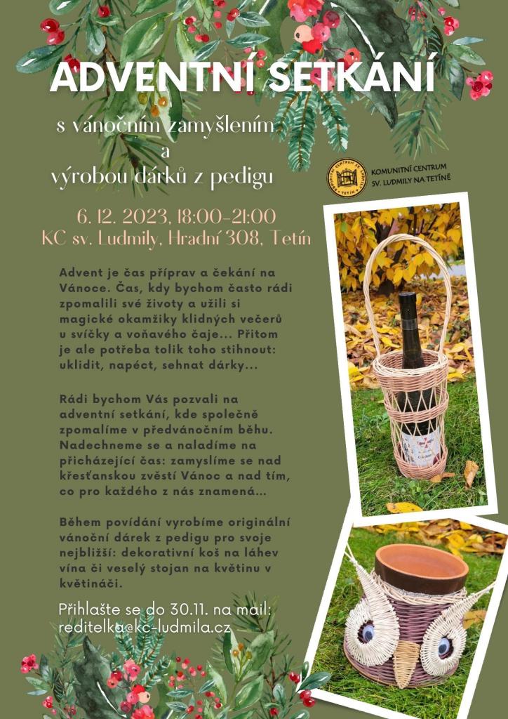 Dne 6.12.2023 od 18h proběhne Adventní setkání v komunitním centru sv.Ludmila s vánočním zamyšlením a výrobou dárků z pedigu. Přihlašte se do 30.11. Těšíme se na vaši přízeň.