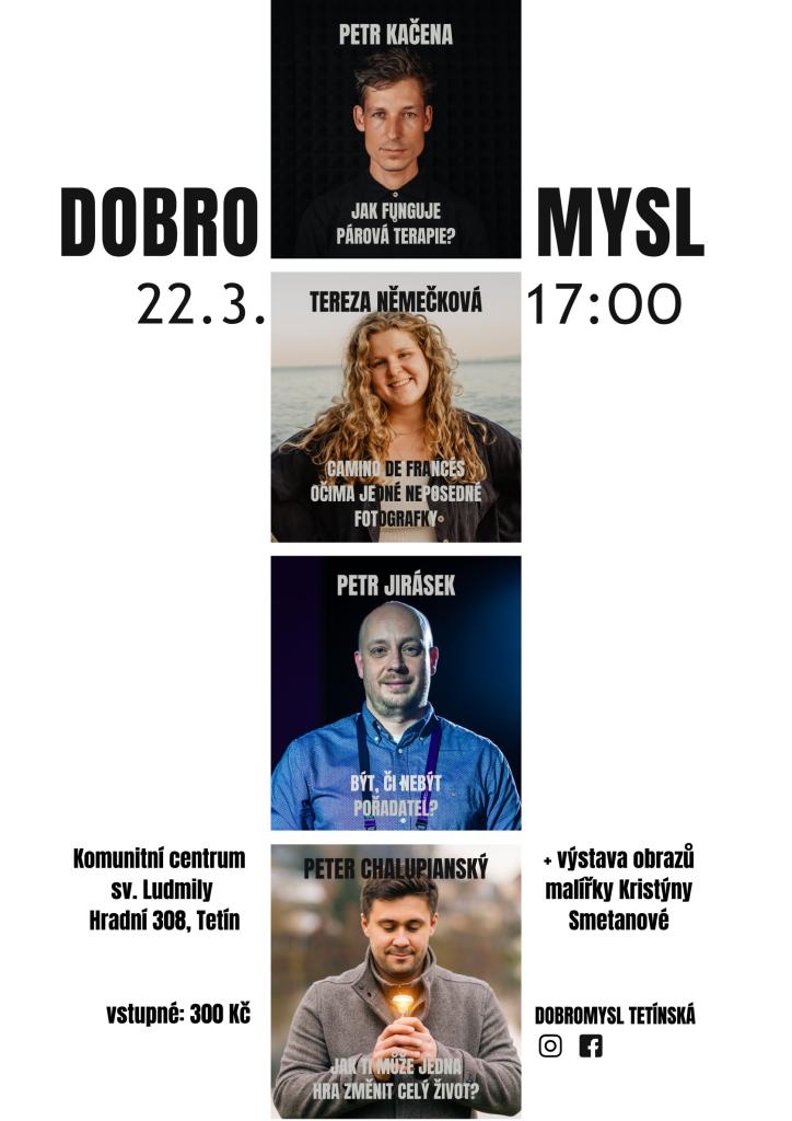 3. ročník inspirativního večera Dobromysl Tetínská přivítá čtyři zajímavé hosty. Petr Kačena, psycholog a párový terapeut. Fotografka Tereza Němečková. Petr Jirásek vás provede exkurzí do zákulisí Apetit festivalu. Peter Chalupianský se ve svém volném čase věnuje neziskovým projektům.