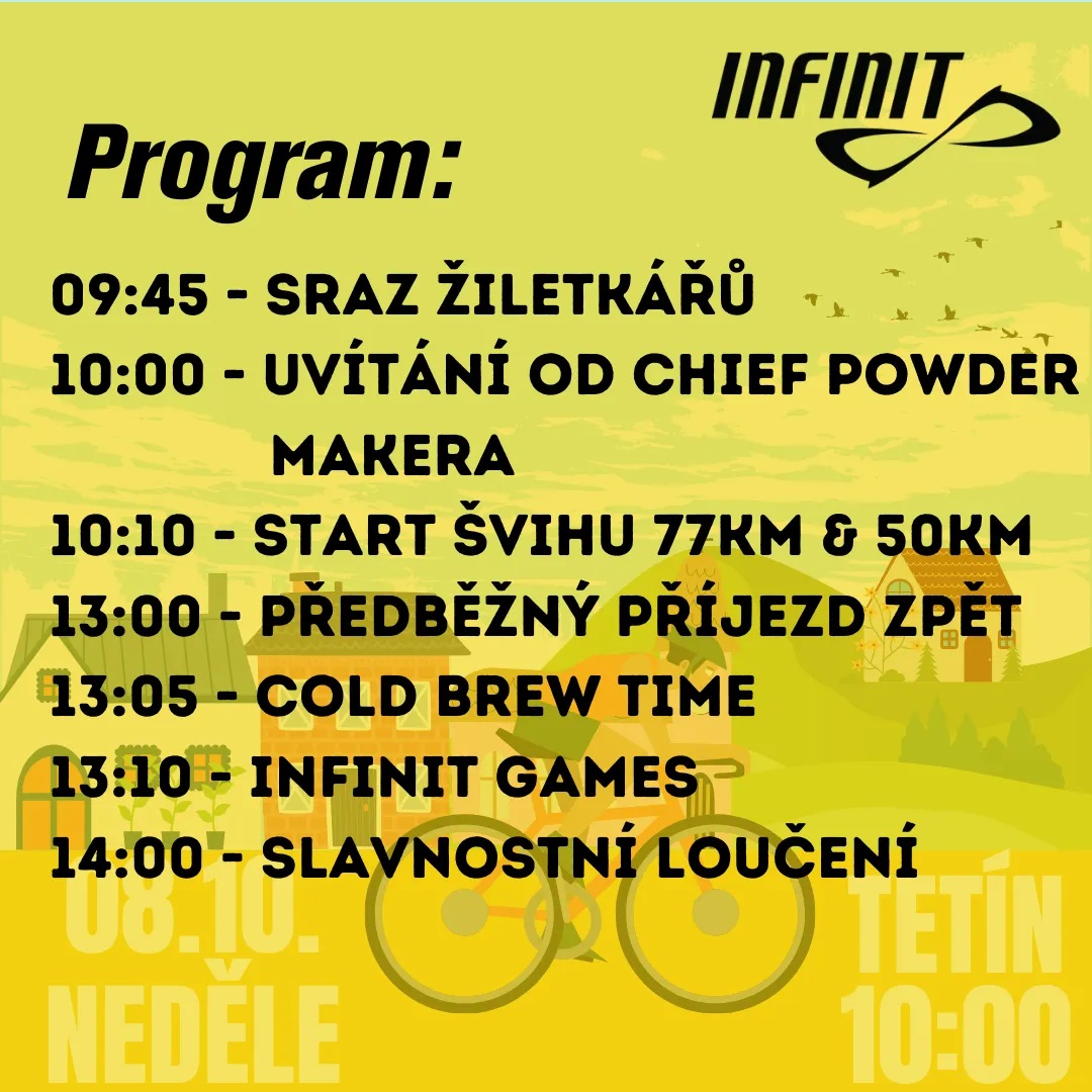 Zdravíme sporťáci, zde najdete poslední detaily našeho společného švihu! Dvě trasy 77km & 50km, palivo a zábava zajištěna! Těšíme se na vás! - team Infinit