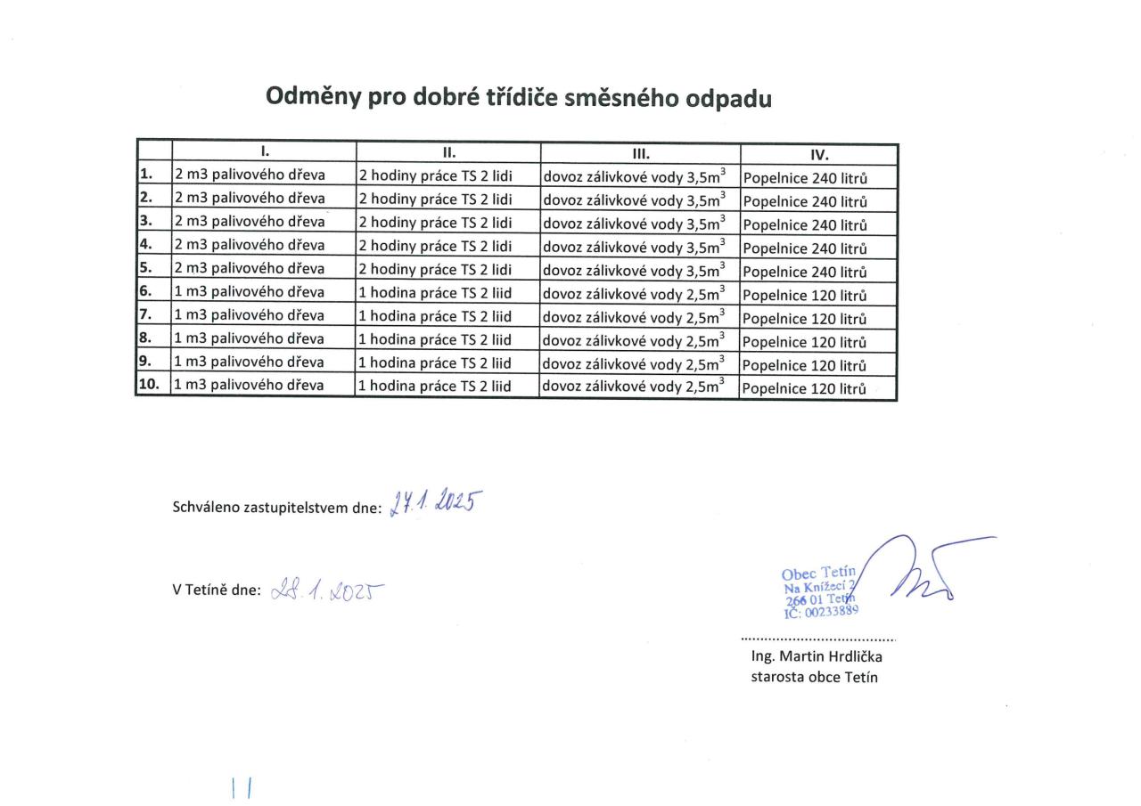 Obec Tetín se snaží snižovat náklady na odpadové hospodářství, a proto je důležité, aby obyvatelé Tetína důsledně třídili směsný odpad. Na základě toho se zastupitelstvo obce Tetín rozhodlo odměnit 10 nejlepších „třídičů" odpadu za rok 2024. Odměny budou poskytovány ve spolupráci s Technickými službami Tetín, a to ve formě služeb nebo materiálního vybavení dle výběru výherce. Přehled odměn viz níže v tabulce.