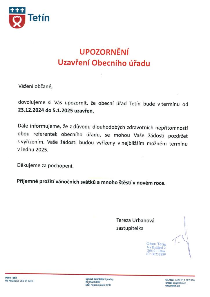 OZNÁMENÍ O UZAVŘENÍ OÚ TETÍN