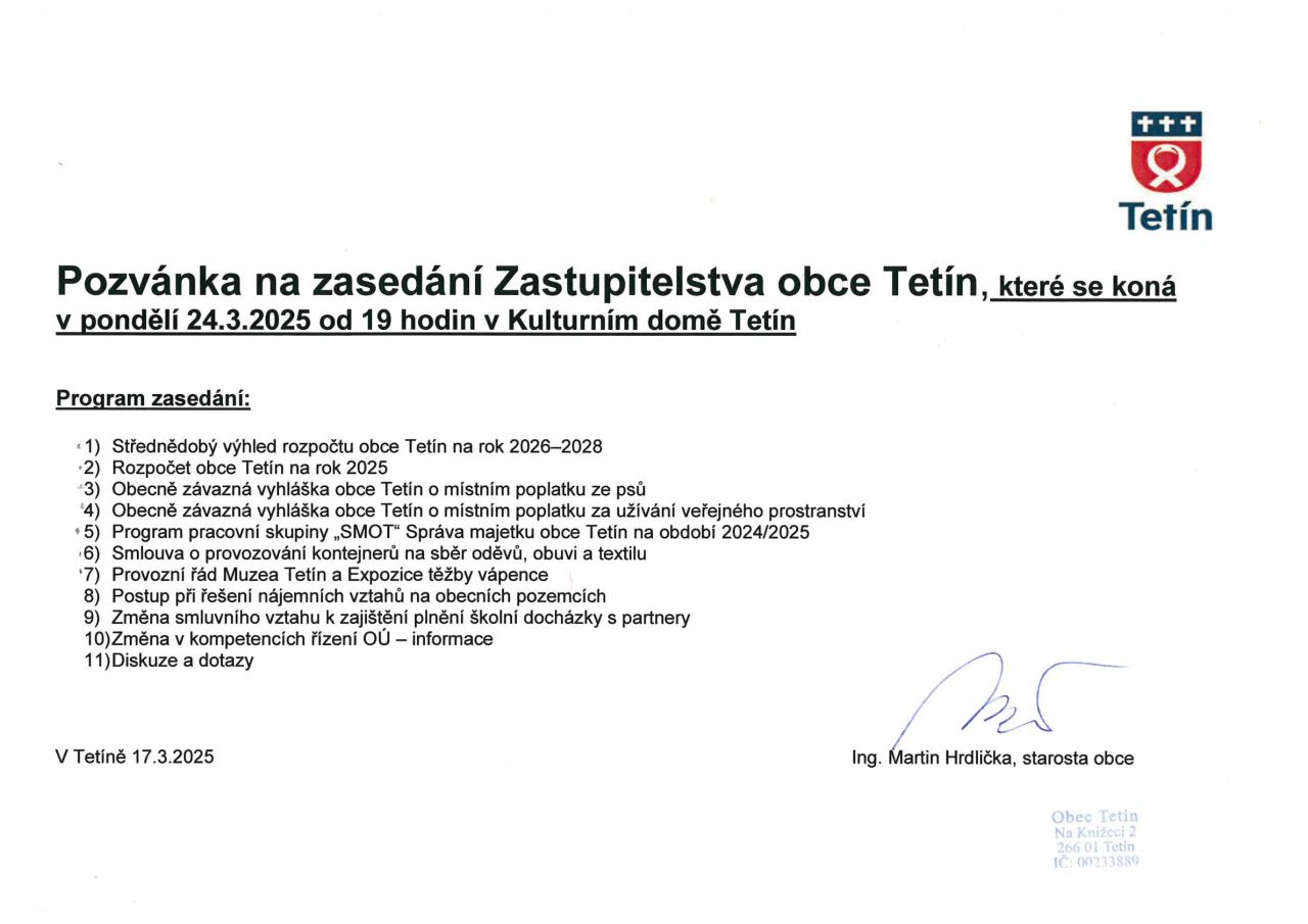 Veřejné zasedání Zastupitelstva obce Tetín se koná dne 24.3.2025 od 19hod.