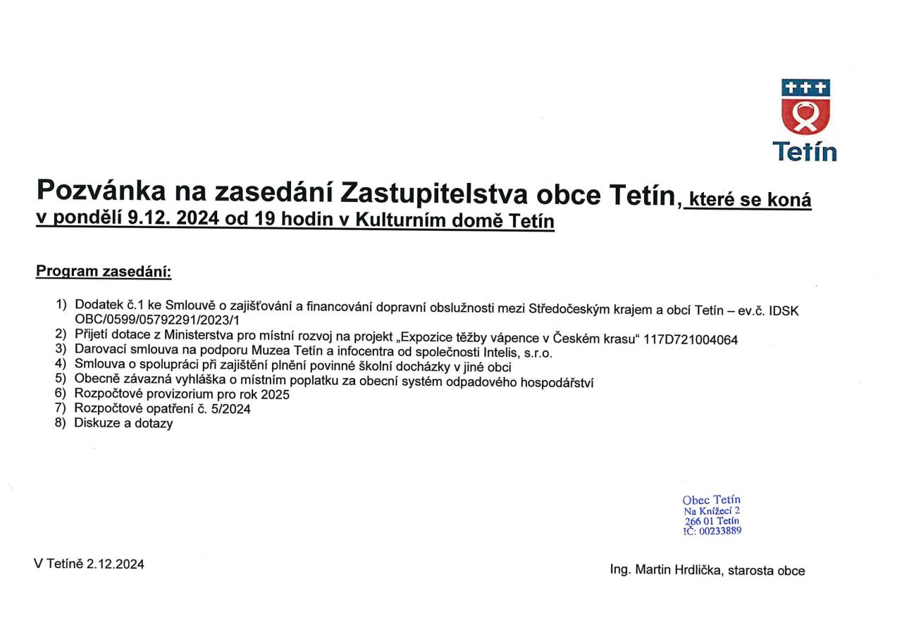 Zasedání Zastupitelstva obce Tetín se bude konat v pondělí 9.12.2024 od 19 hod.
