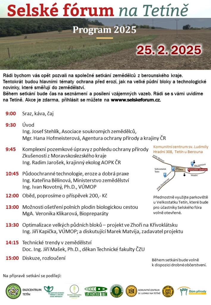 Selské fórum se bude konat dne 25.2.2025 na Tetíně, začátek akce bude v 9:00 v Komunitním centru na Tetíně.