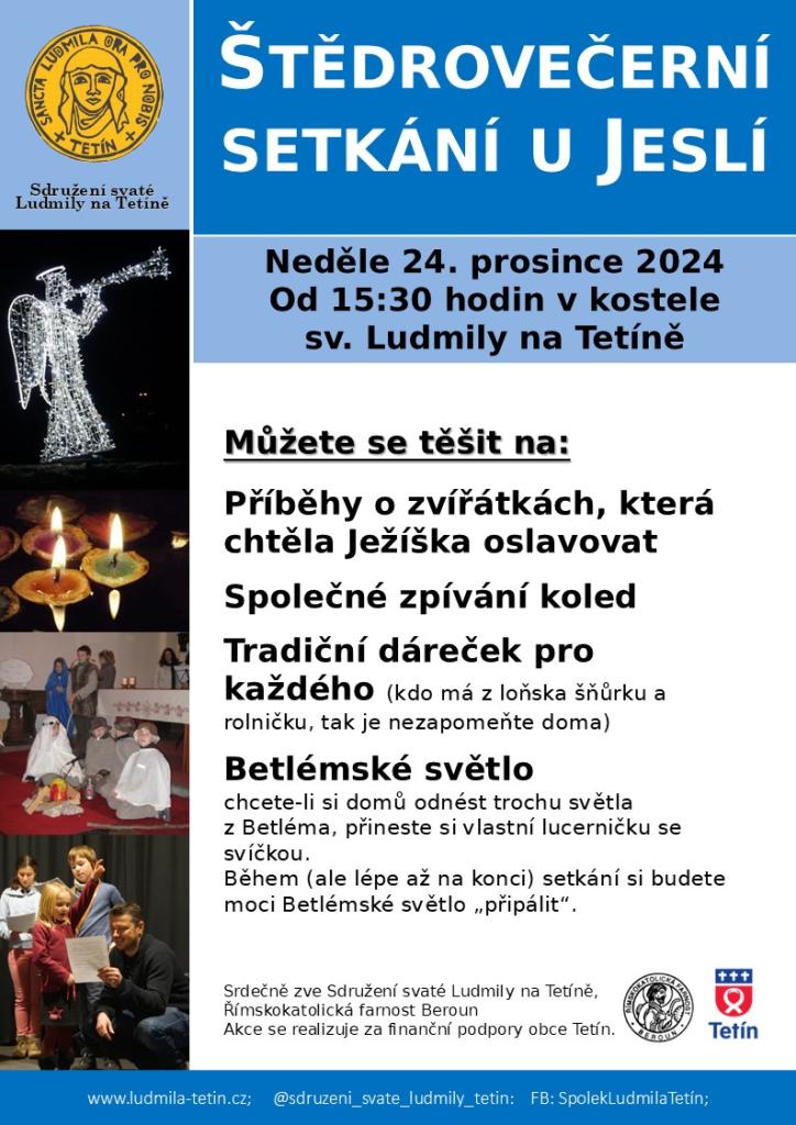 V neděli 24.12.2024 od 15:30 hod v kostele sv. Ludmily na Tetíně proběhne Štědrovečerní setkání u Jeslí.