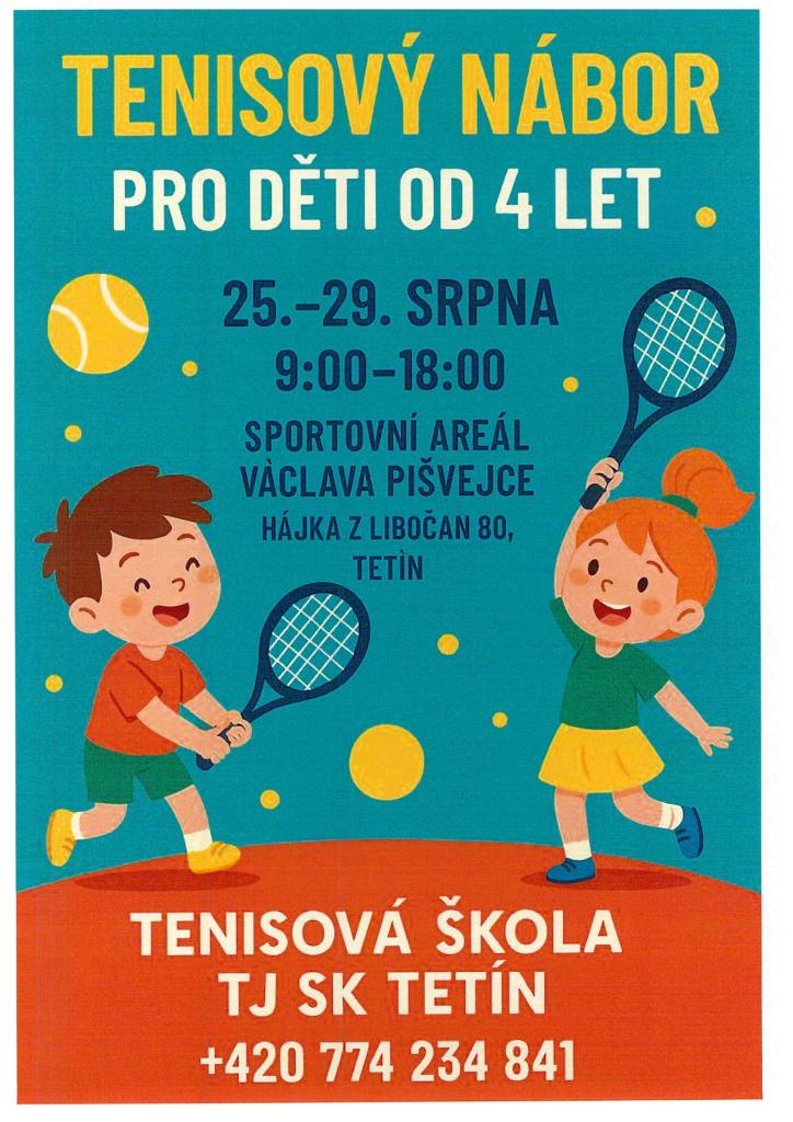 TJ SK Tetín s radostí oznamuje zahájení náboru pro děti od 4 let do své tenisové školy. Tato příležitost je určena pro všechny malé nadšence, kteří se chtějí naučit hrát tenis a užít si spoustu zábavy. Pro více informací nás neváhejte kontaktovat na uvedeném telefonním čísle.