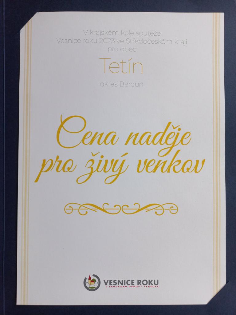 Tetín získal v soutěži Vesnice roku 2023 ocenění: Cena naděje pro živý venkov ve Středočeském kraji. :-) A postupujeme v této kategorii do celostátního kola.