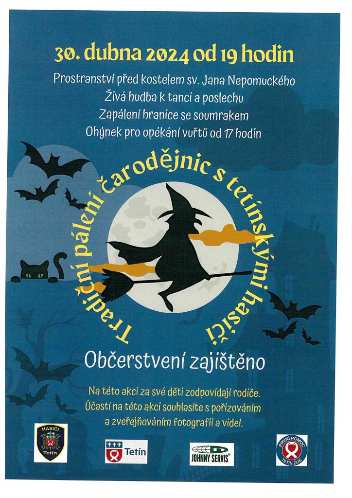 30.4.2024 od 19 hodin proběhne před kostelem sv. Jana Nepomuckého tradiční pálení čarodějnic s tetínskými hasiči. Na této akci si za své ratolesti zodpovídají rodiče !!! Děkujeme za pochopení a těšíme se na hojnou účast !