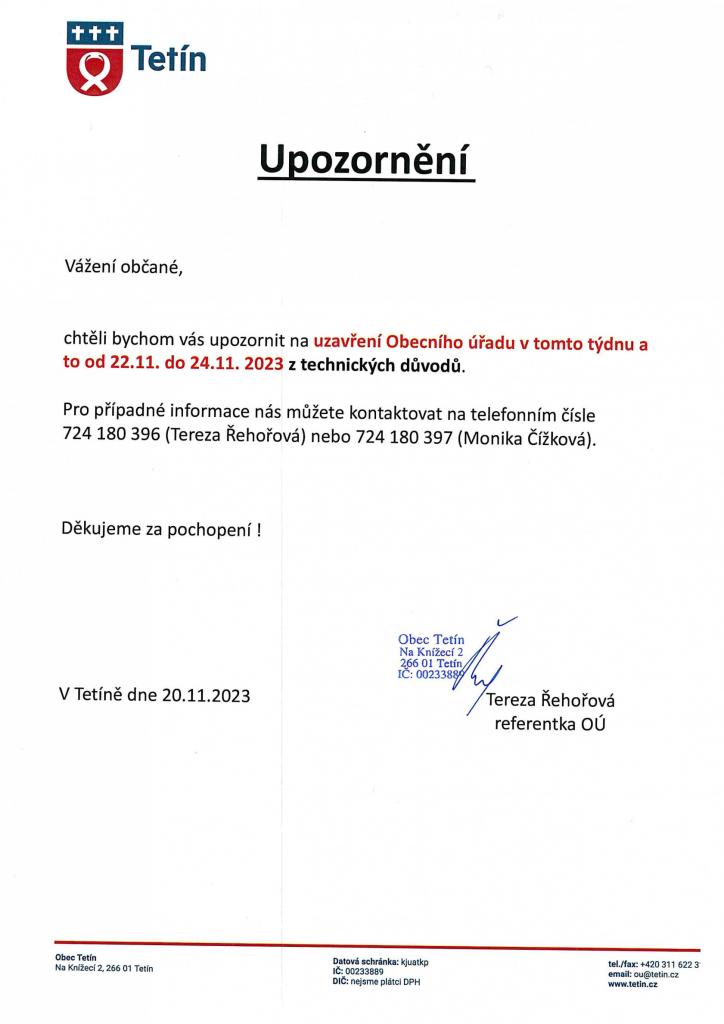 Z technických důvodů bude OÚ ve dnech 22.11. - 24.11.2023 uzavřen. Děkujeme za pochopení !