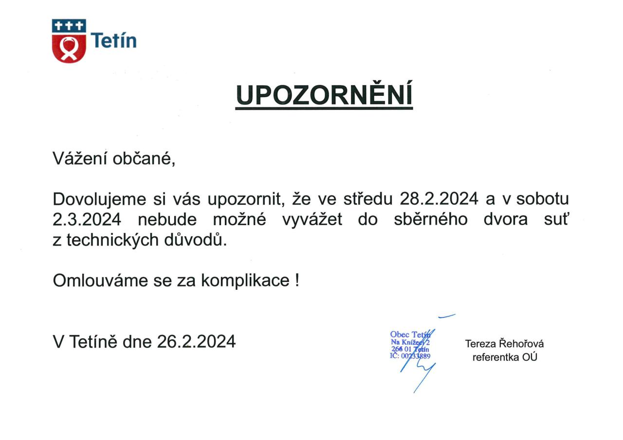 Ve středu 28.2. a v sobotu 2.3.2024 nebude možné vyvážet do Sběrného dvora Tetín suť z technických důvodů.