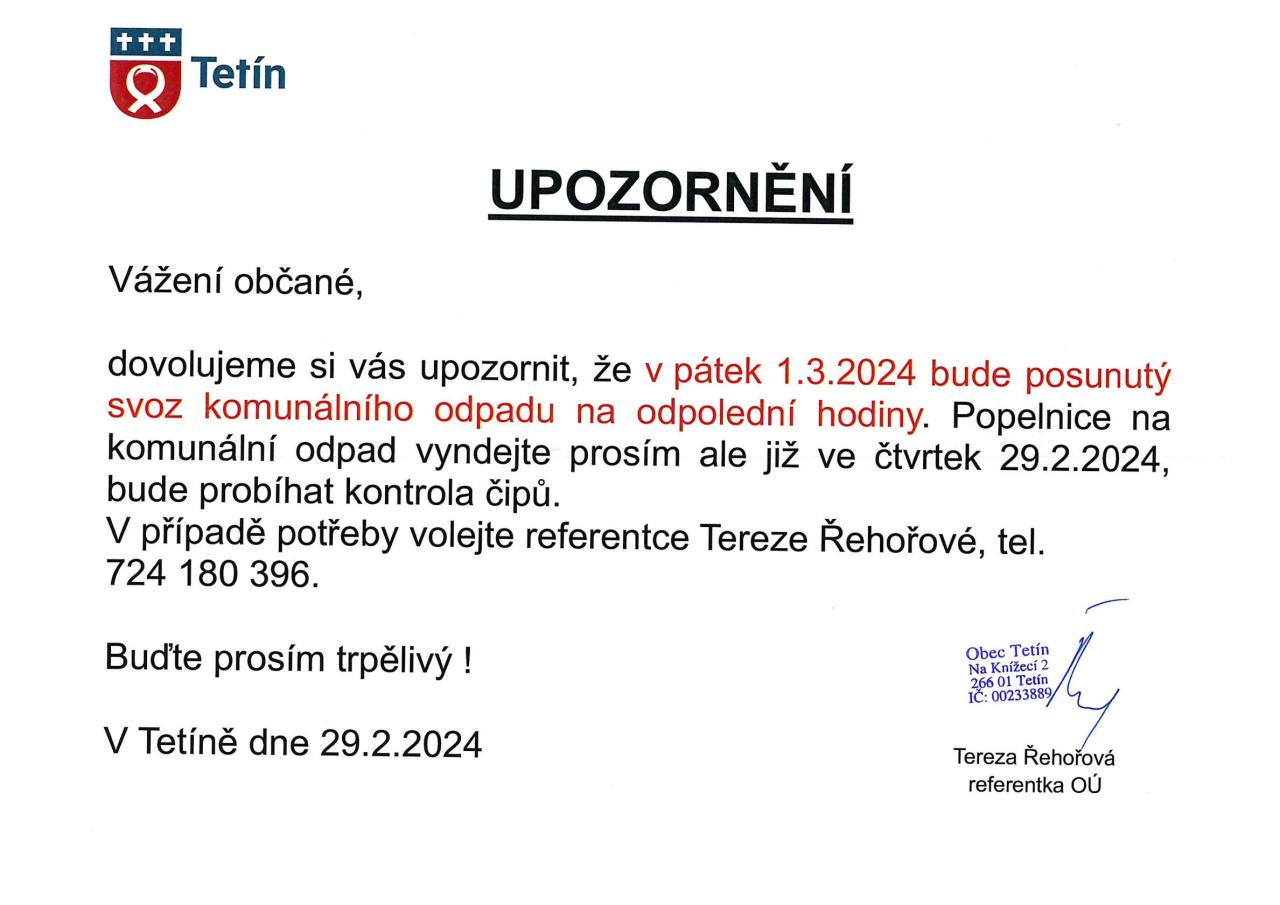 Posunutí svozu komunálního odpadu na odpolední hodiny 1.3.2024.