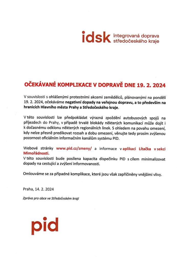 Pražská integrovaná doprava nám zaslala informaci o očekávané komplikaci v dopravě dne 19.2.2024 v souvislosti s ohlášenými protestními akcemi zemědělců.