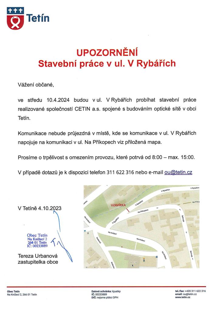 ve středu 10.4.2024 nebude průjezdná komunikace v ulici V Rybářích